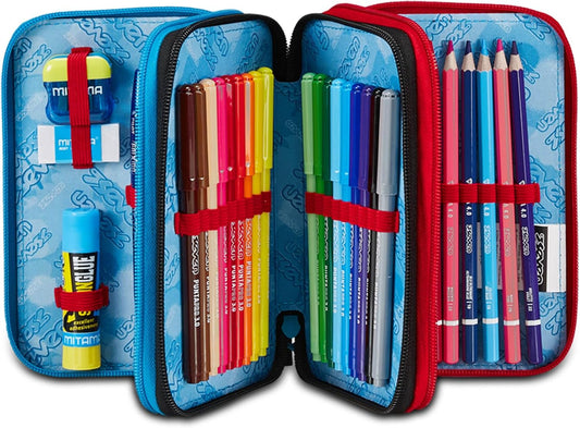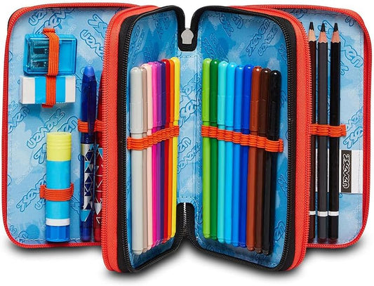 Seven Astuccio Scuola 3 Zip, Nero Rosso Azzurro, Half Street, Portapenne Triplo Scomparto Completo Di Penne, Matite, Colori, Accessori Zaino, Elementari, Medie, Bambino