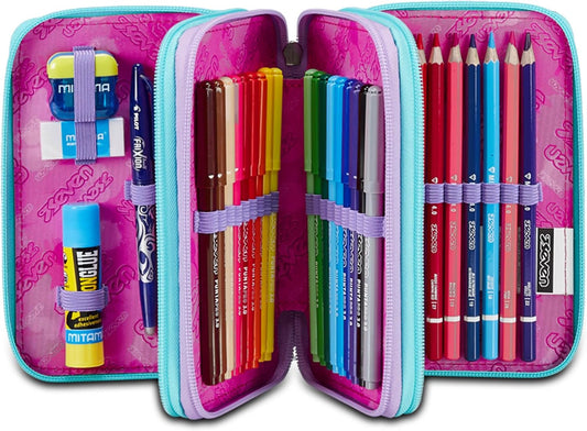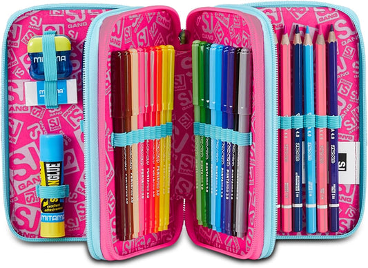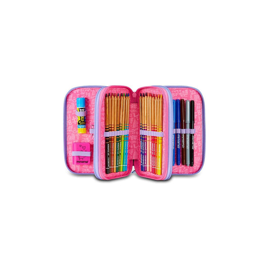 SJ Gang Astuccio Scuola 3 Zip, Rosa, Pinkfur, Portapenne Triplo Scomparto Completo Di Penne, Matite, Colori, Accessori Zaino, Elementari, Medie, Bambina, 30C202431-5C1
